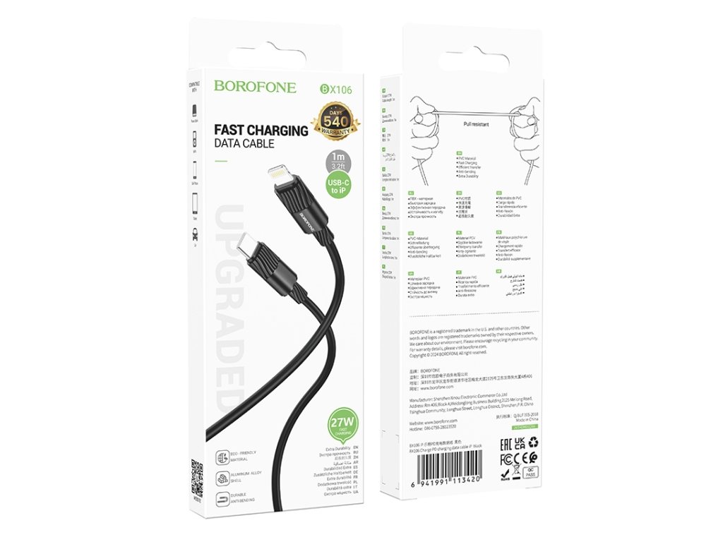 27W nabíjací kábel BOROFONE BX106 USB-C / Lightning v elegantnej čiernej farbe ponúka rýchle a bezpečné nabíjanie vášho iPhonu či iPadu.
