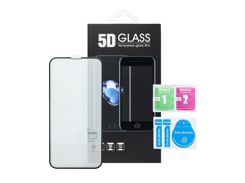 Obsah balenia: 1x 5D Tvrdené sklo Full Glue, 1x vlhčená utierka (alkoholová), 1x suchá utierka z mikrovlákna, nálepky na odstránenie prachu.