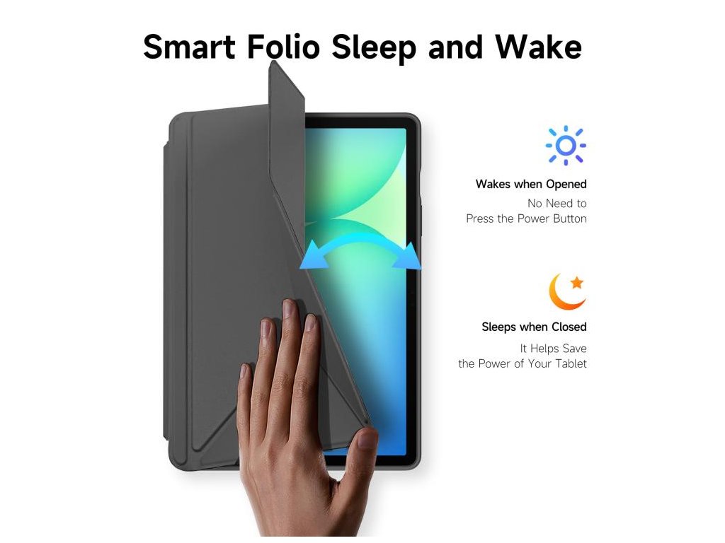 Kryt je vyrobený z kvalitnej PU kože s jemným povrchom a pevnej zadnej časti z polykarbonátu, čo poskytuje spoľahlivú ochranu pred nárazmi, poškriabaním aj bežným opotrebením. Vďaka funkcii automatického prebudenia a uspávania displeja šetrí batériu vášho zariadenia a zjednodušuje jeho používanie.