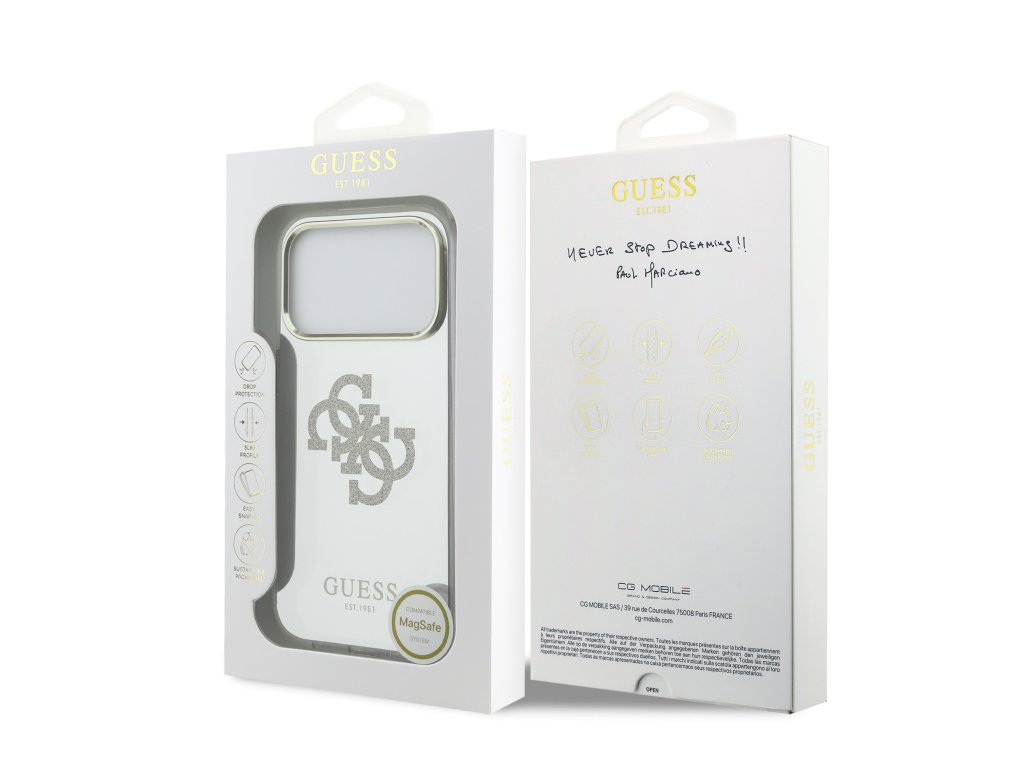 Guess PC/TPU Mirror 4G Glitter Logo MagSafe zadní kryt je dokonalý doplněk pro váš telefon i váš outfit, který kombinuje funkčnost a styl v jednom.