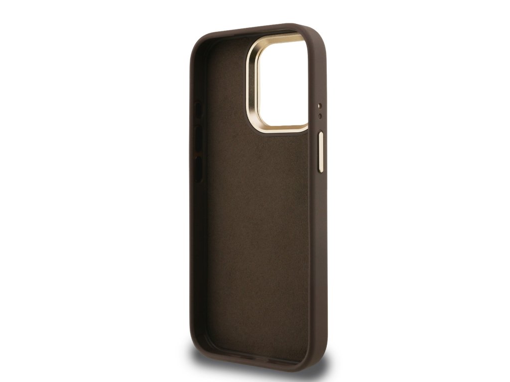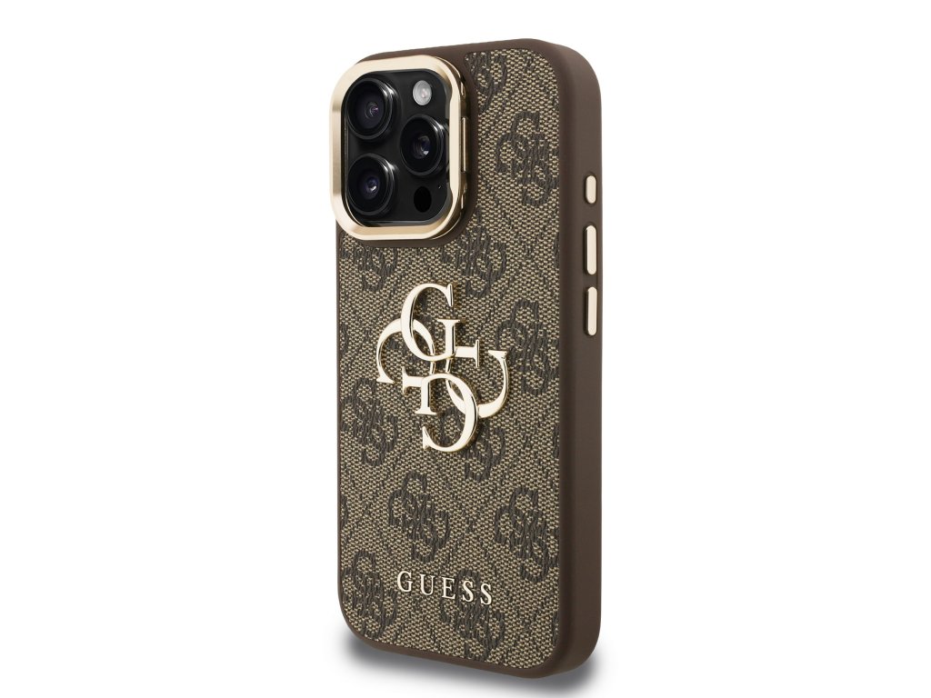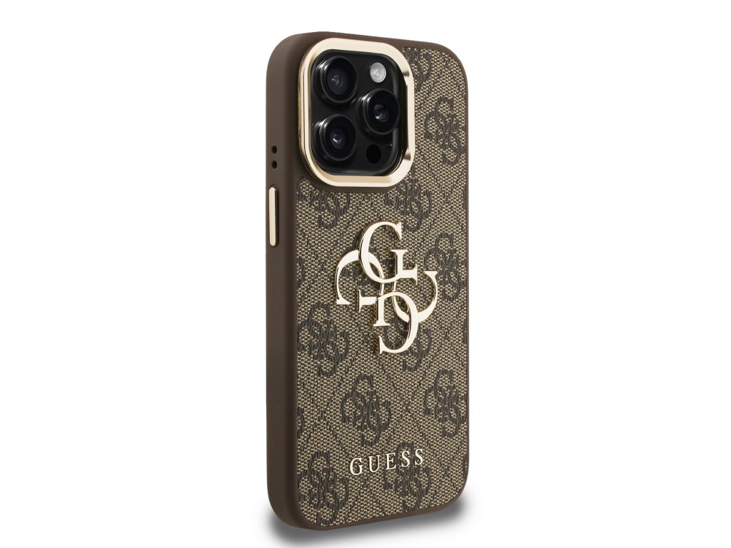 Guess PU 4G Metal Logo Stand Camera Frame Zadní Kryt pro iPhone 15 Pro Max Brown