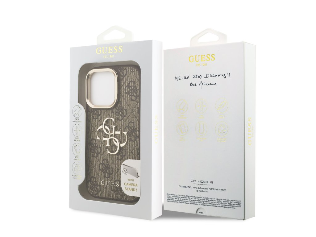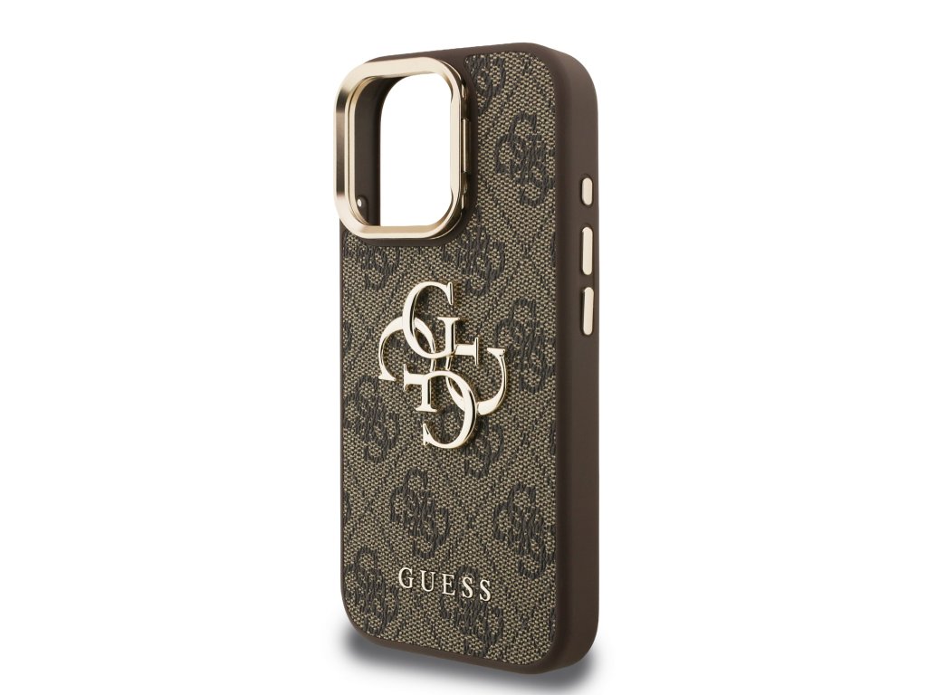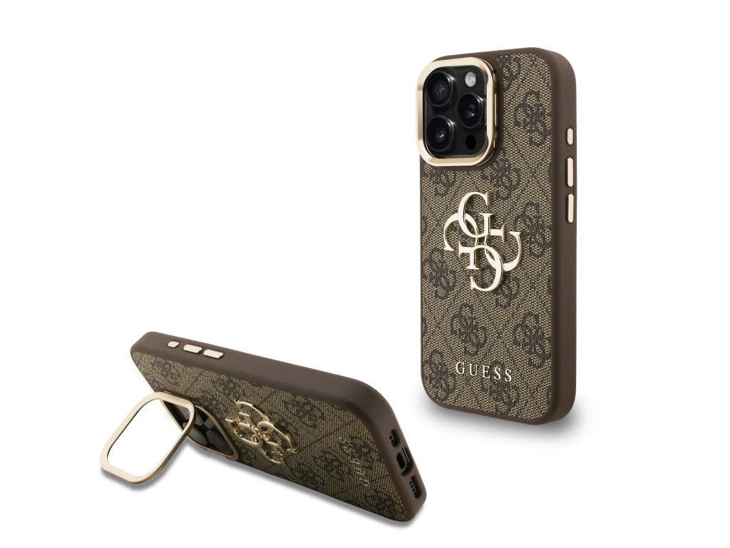 Prémiový zadní kryt Guess PU 4G Metal Logo Stand Camera Frame se vyznačuje elegantním, charakteristickým 4G vzorem, doplněným o logo GUESS.