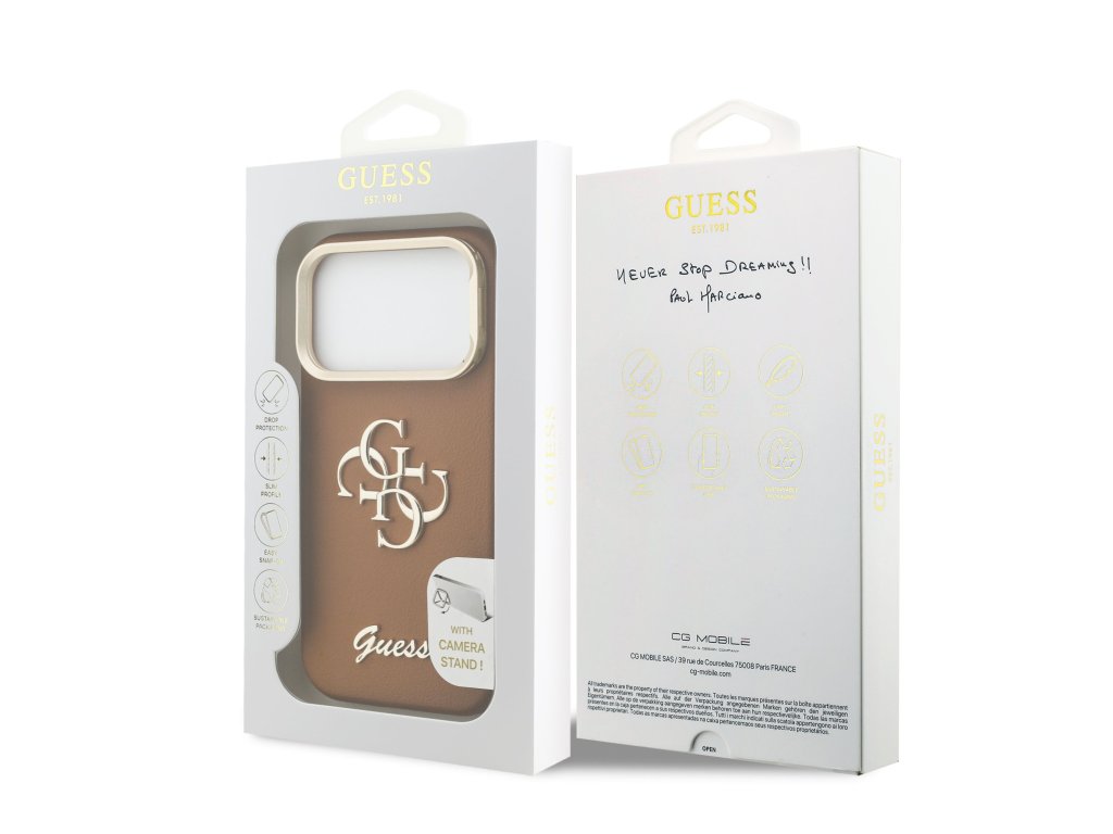 Guess PU Grained 4G Logo Stand Camera Frame zadní kryt je dokonalý doplněk pro váš telefon i váš outfit, který kombinuje funkčnost a styl v jednom.