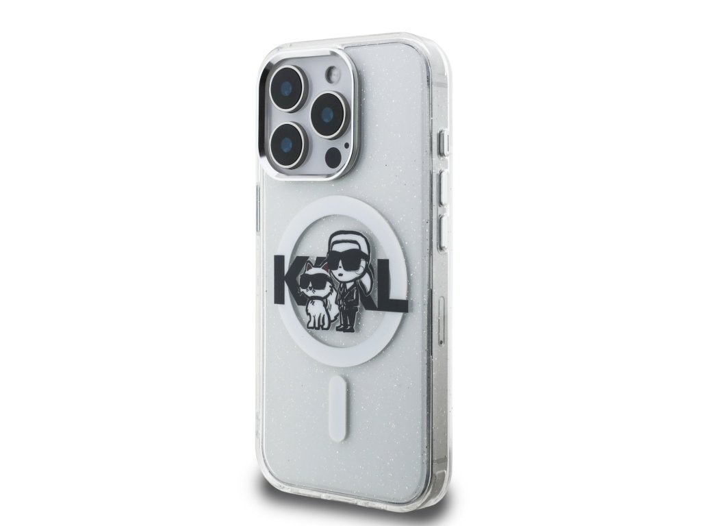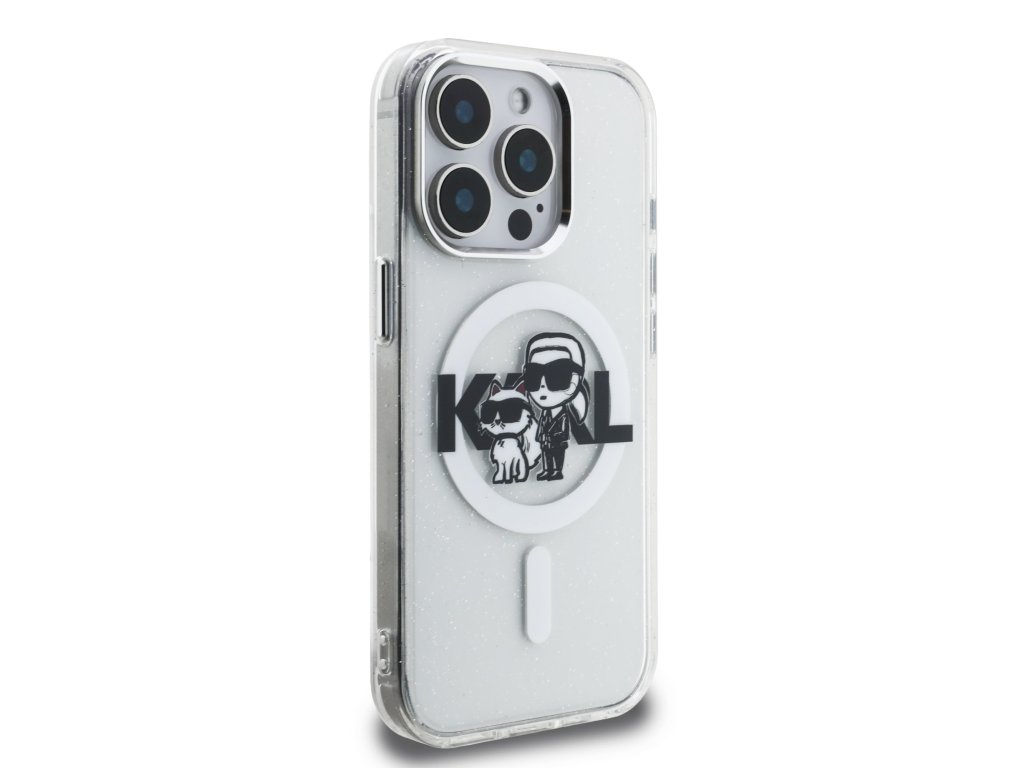Karl Lagerfeld IML Glitter Karl and Choupette Sketch MagSafe zadní kryt je dokonalý doplněk pro váš telefon i outfit, který kombinuje funkčnost a styl v jednom.