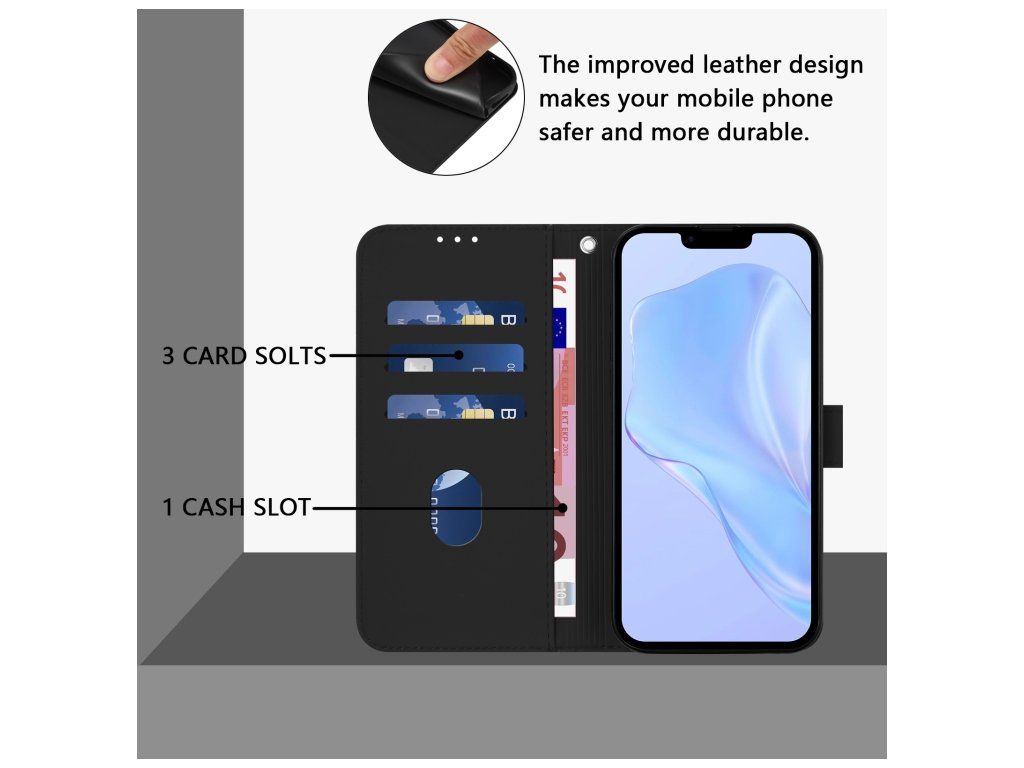 - Materiál: Syntetická PU koža (Skin Feel úprava) + pružný TPU rám