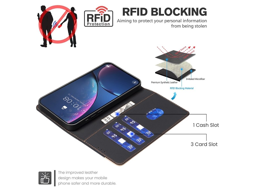 - RFID ochrana: Puzdro je vybavené špeciálnou vrstvou, ktorá chráni vaše karty pred nežiaducim skenovaním a krádežou údajov, čím zabezpečuje bezpečnosť vašich finančných prostriedkov.