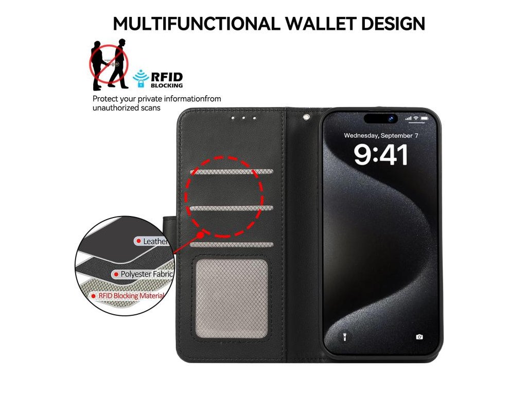 Puzdro ponúka integrovanú RFID ochranu, ktorá zabraňuje krádeži dát z vašich platobných a identifikačných kariet. Vnútro obsahuje viacero priehradiek na karty či hotovosť, čím nahrádza peňaženku. Magnetické zatváranie chráni displej pred poškodením a nečistotami, zatiaľ čo precízne výrezy umožňujú plný prístup ku všetkým funkciám telefónu bez nutnosti vyberať ho z puzdra.