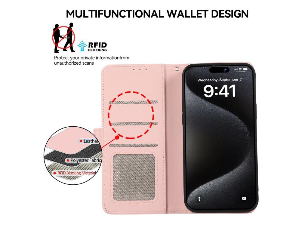 Puzdro má vstavanú RFID ochranu, ktorá zabraňuje neoprávnenému čítaniu vašich platobných a identifikačných kariet. Vo vnútri nájdete priehradky na karty a hotovosť, vďaka čomu môžete telefón nosiť ako peňaženku. Z vonkajšej strany zaujme jemný materiál v ružovej farbe, ktorý je príjemný na dotyk a zároveň odolný voči opotrebeniu. Magnetické zapínanie udrží puzdro pevne zatvorené a ochráni displej aj zadnú časť zariadenia.