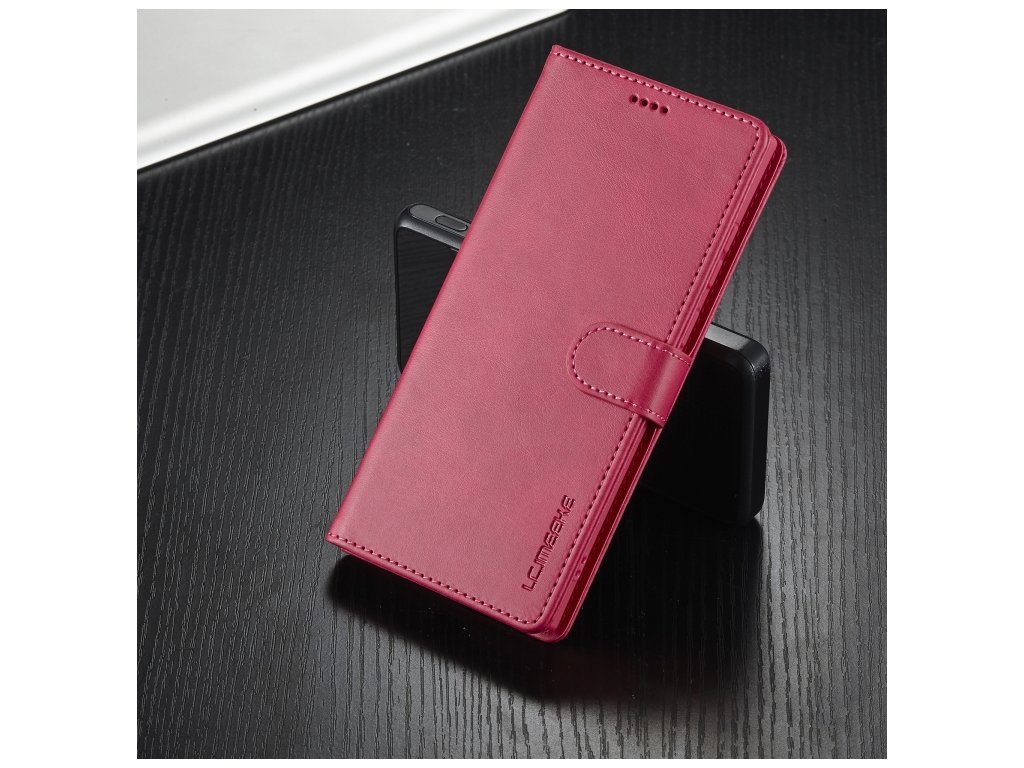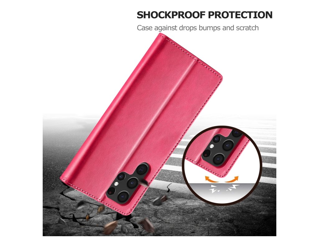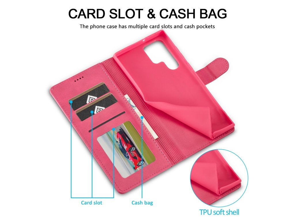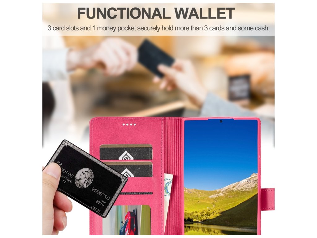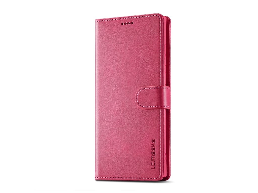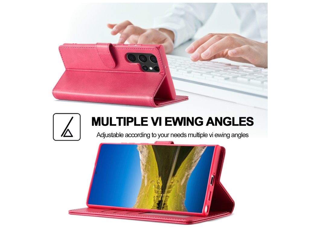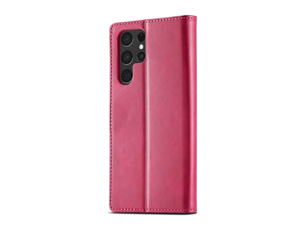 Knižkové puzdro LC.IMEEKE pre telefón Samsung Galaxy S25 Ultra 5G v sofistikovanej ružovo-červenej farbe s textúrou kože prináša dokonalú ochranu, štýl a praktickosť.