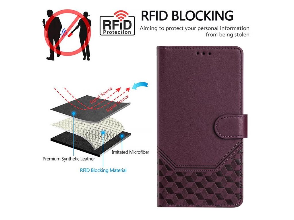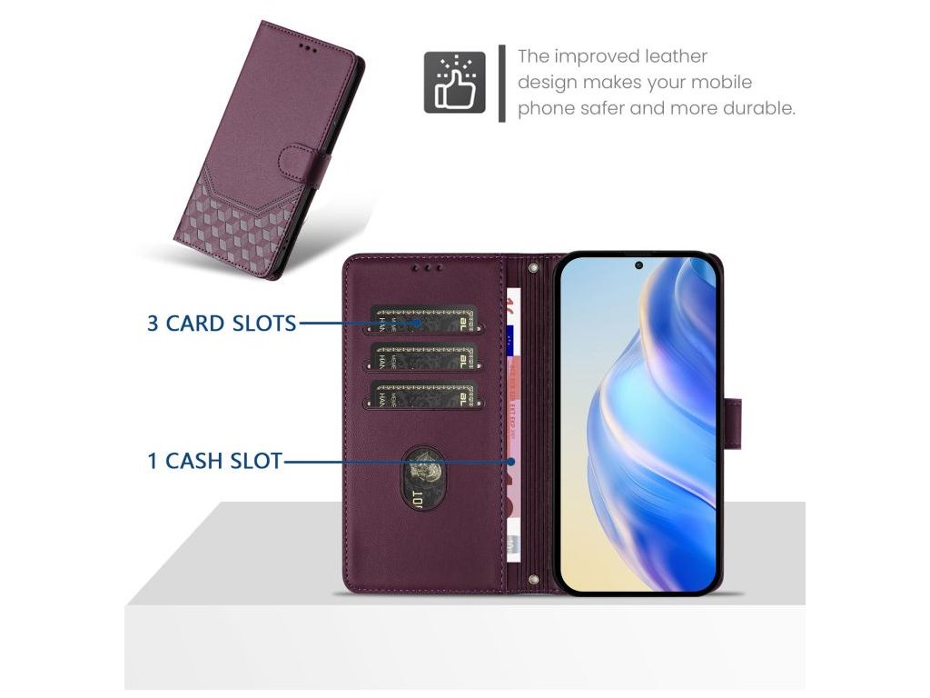 Toto elegantné fialové puzdro s reliéfnym vzorom v tvare včelieho plástu ponúka nielen moderný vzhľad, ale aj funkciu RFID ochrany proti neoprávnenému skenovaniu kariet.