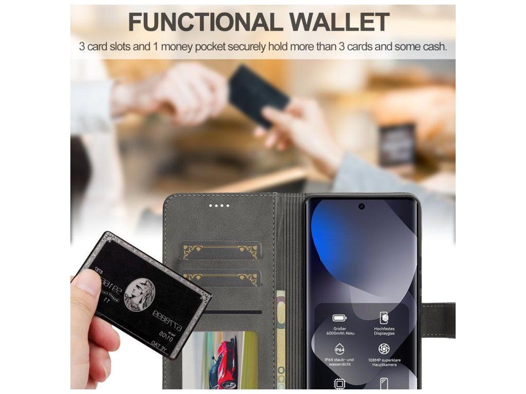 Praktická peňaženka vždy poruke Nechce sa vám brať so sebou klasickú peňaženku? Žiadny problém. Na vnútornej strane predného krytu sú integrované presné výrezy na platobné karty, občiansky preukaz, vizitky či poskladané bankovky. Vaše najdôležitejšie veci máte bezpečne uložené priamo pri telefóne.