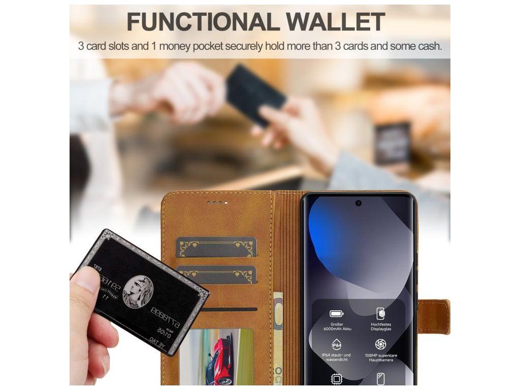 Praktická peňaženka vždy poruke Nechce sa vám brať so sebou klasickú peňaženku? Žiadny problém. Na vnútornej strane predného krytu sú integrované presné výrezy na platobné karty, občiansky preukaz, vizitky či poskladané bankovky. Vaše najdôležitejšie veci máte bezpečne uložené priamo pri telefóne.