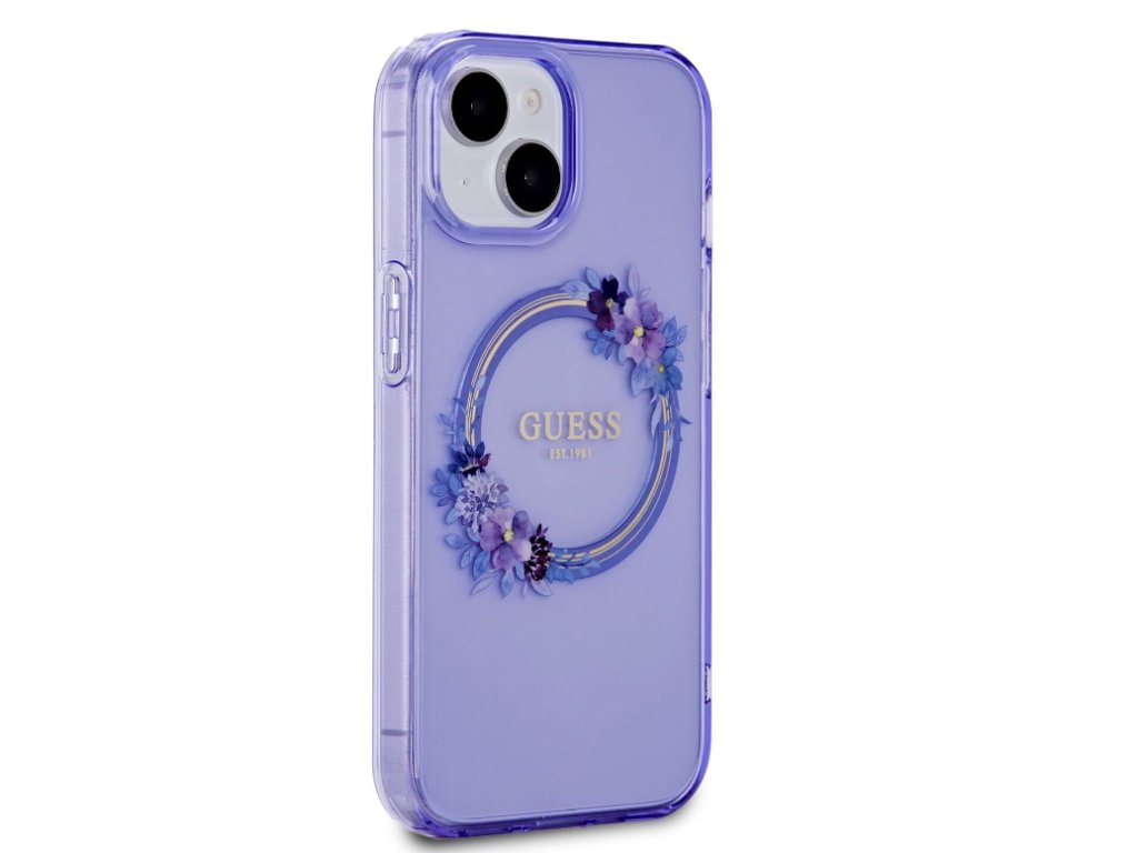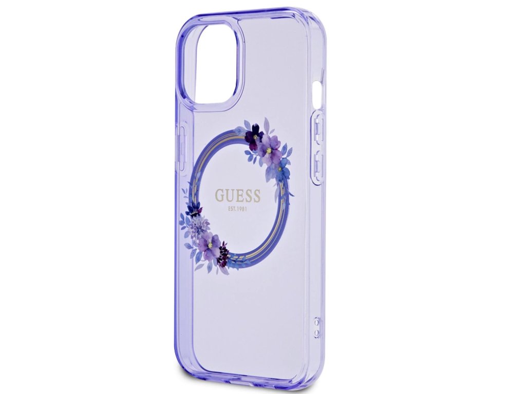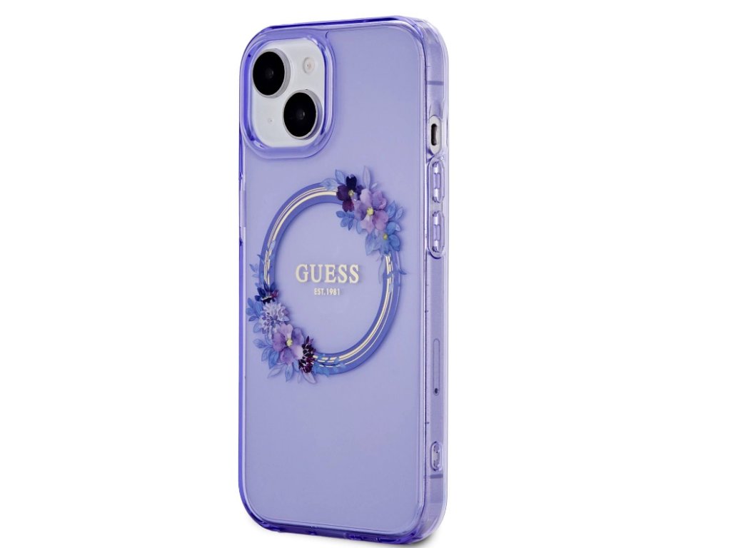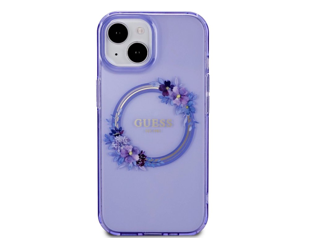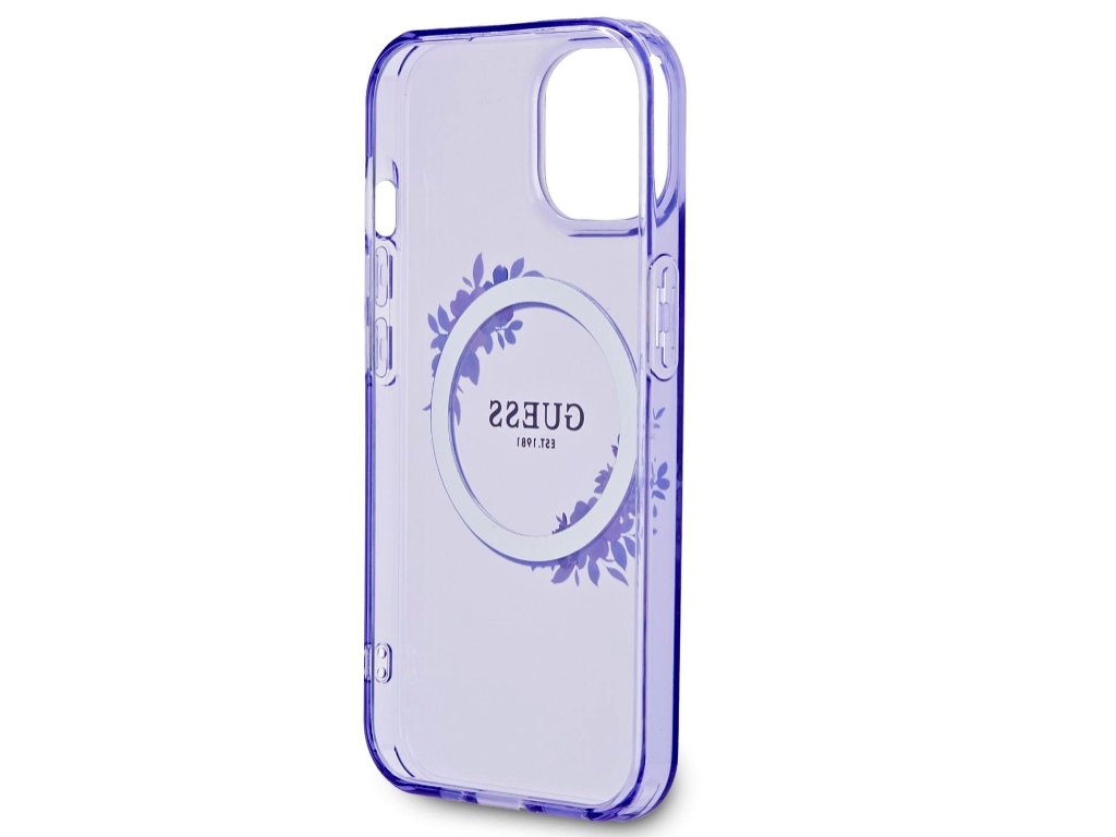 Kryt GUESS pre iPhone 15 MagSafe s kvetinovým motívom fialová farba