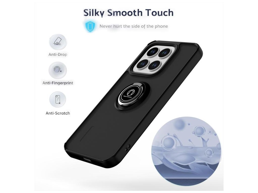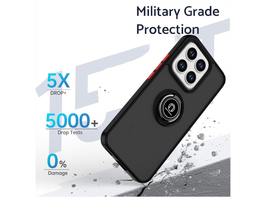 Robustný dizajn z kombinácie TPU a polykarbonátu účinne chráni pred pádmi a nárazmi, zatiaľ čo integrovaný kovový krúžok slúži ako držiak na prst, stojan pre pohodlné sledovanie videí a zároveň je kompatibilný s magnetickými držiakmi do auta. Vnútorné vzduchové vankúšiky v rohoch zvyšujú odolnosť pri náraze, a presné výrezy zabezpečujú jednoduchý prístup ku všetkým funkciám telefónu.