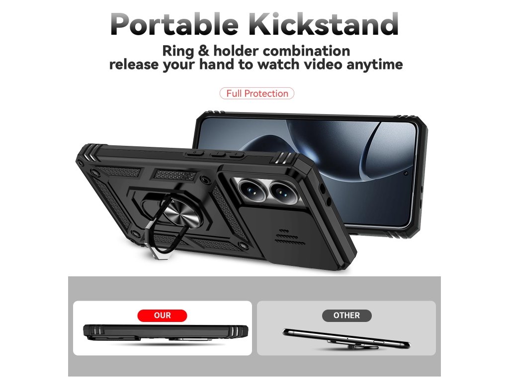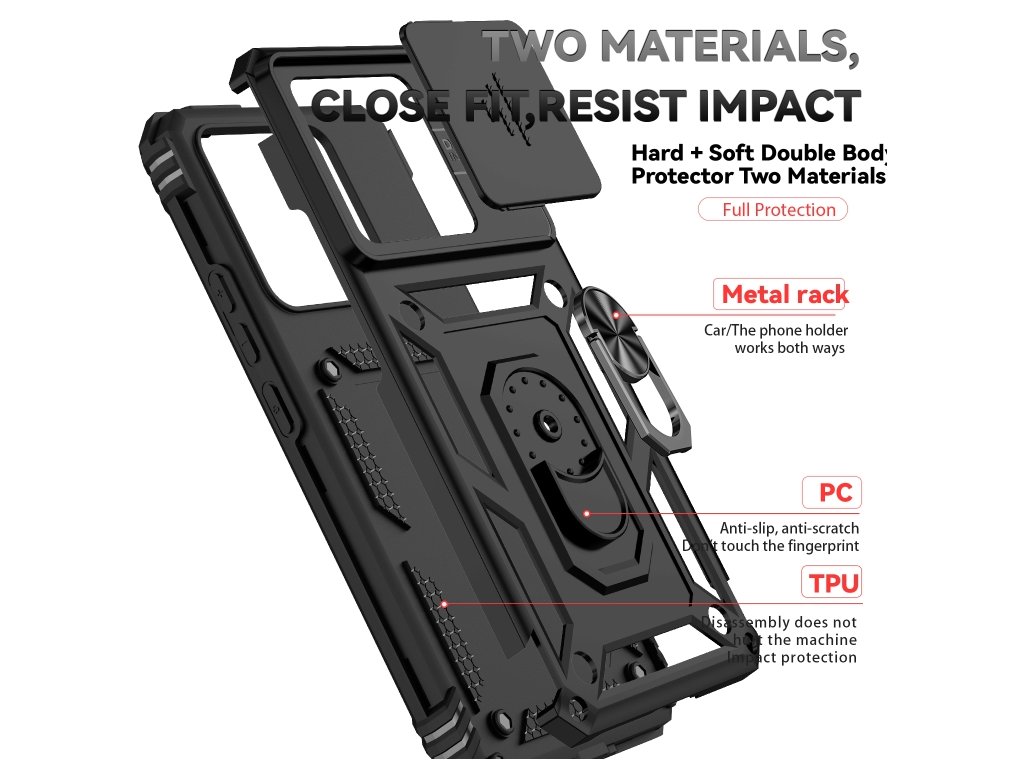 Telo krytu je vyrobené z odolného plastu a flexibilného TPU, čo zabezpečuje pevnosť aj pohodlný úchop. Vstavaný stojan na zadnej strane umožňuje jednoduché sledovanie videí, videohovory či prácu bez nutnosti držať telefón v ruke. Kryt má presné výrezy na všetky porty a ovládacie prvky, takže nijako neobmedzuje používanie telefónu.