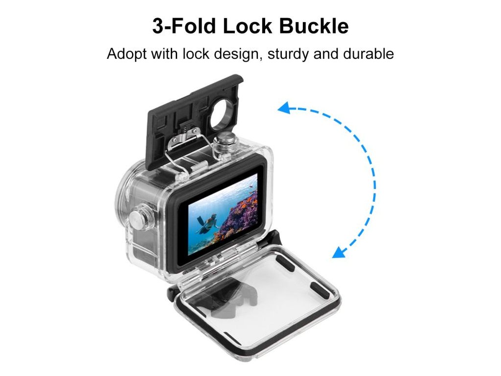 Vyrobené z odolného PC materiálu a tvrdeného optického skla, poskytuje puzdro spoľahlivú ochranu proti vode, nárazom, prachu a škrabancom. Predná šošovka so skleneným krytom zaručuje čistý a ostrý obraz bez skreslenia.