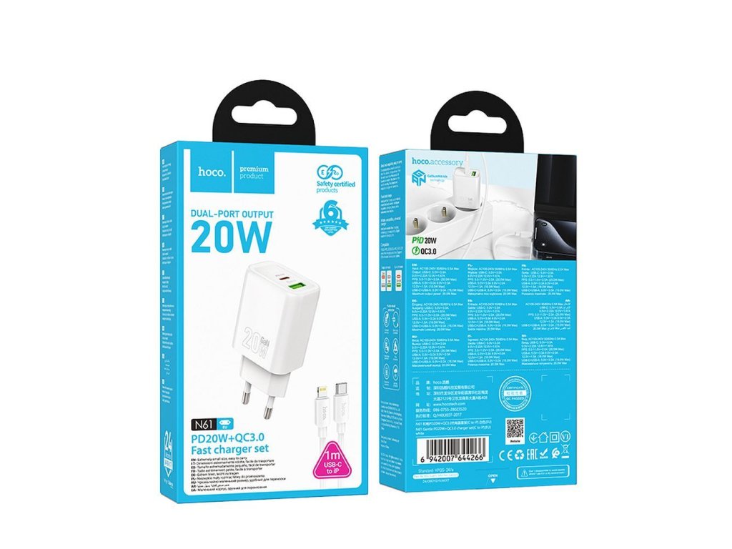 Obsah balenia: 1x Sieťová nabíjačka Hoco N61 (Biela) 1x Nabíjací kábel USB-C na Lightning (Biely)